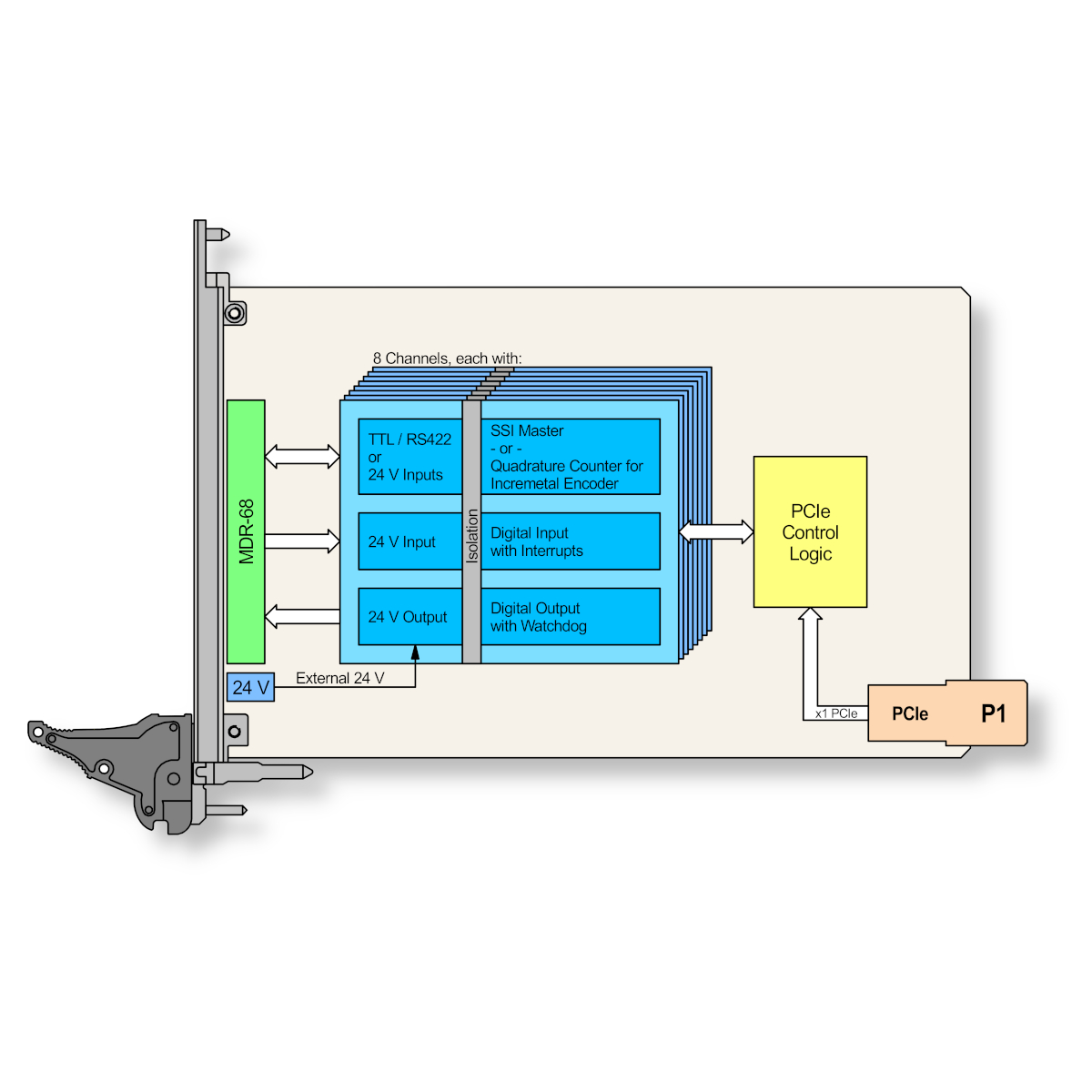 Each of the eight fully isolated channels can be configured as an SSI master, a quadrature counter for incremental encoders, or a general-purpose 32-bit counter, making the TCPS118 one of the most versatile encoder interface cards available for CompactPCI Serial systems. Input compatibility covers both TTL/RS422 (TCPS118-10R) and 24 V industrial signals (TCPS118-20R), with an integrated digital filter on every channel for reliable operation in electrically noisy environments.