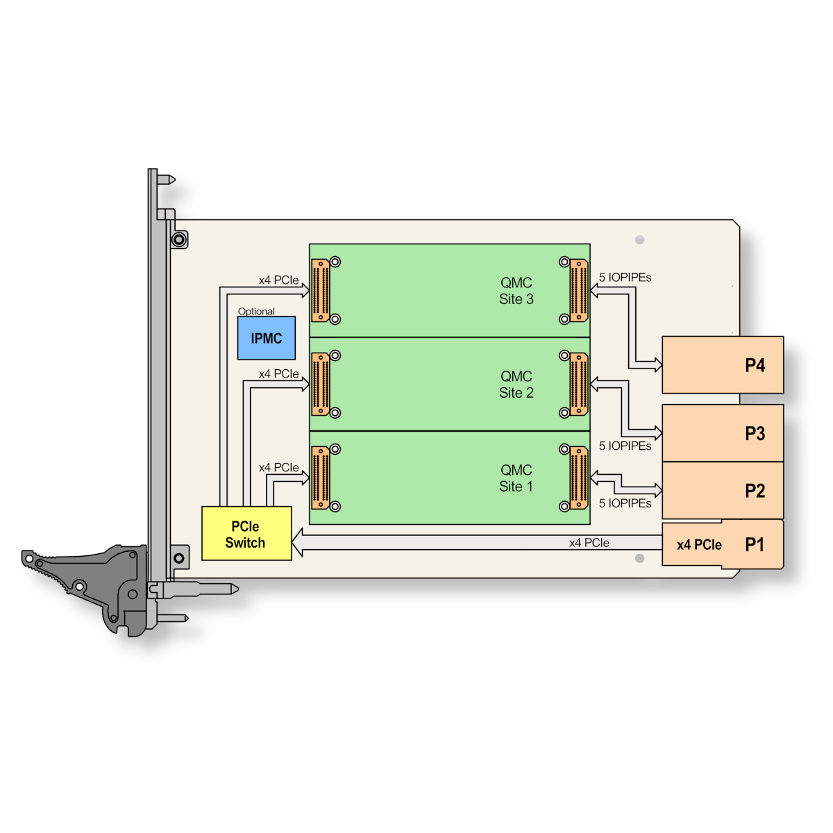 The PCI Express x4 link from the host board (CompactPCI-Serial CPU) is distributed to the 3 QMC sites as x4 links by a non-blocking PCI-Express switch.