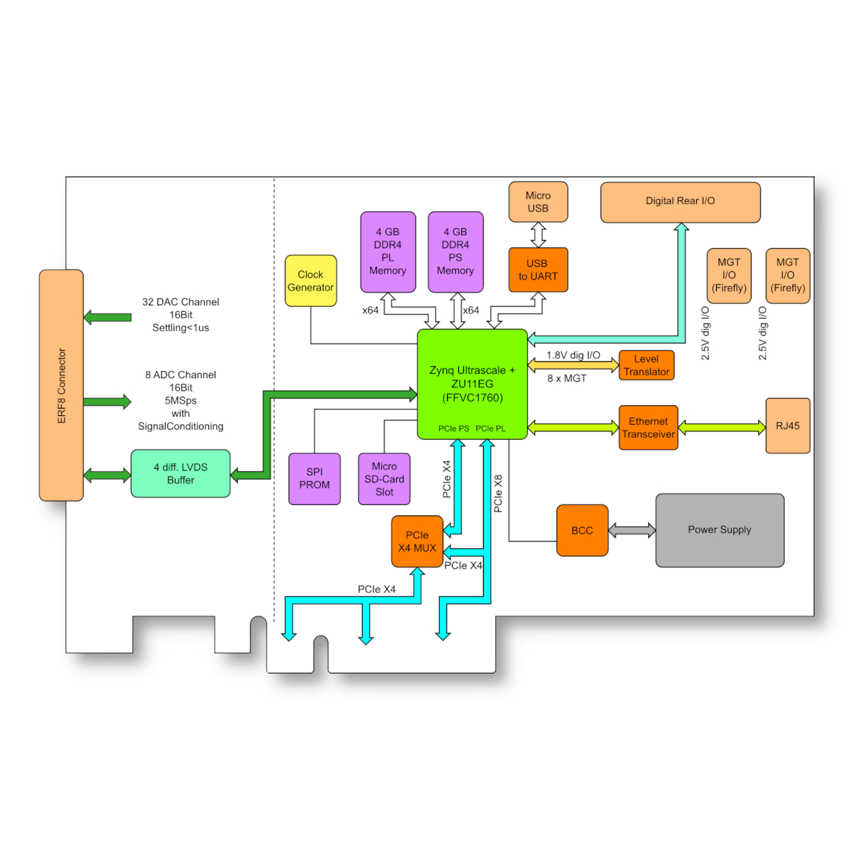 Reconfigurable MPSoC with 32 x 16 bit Analog Output; 8 x 16 bit differential Analog Input; Xilinx XCZU11EG-1FFVC1760I; DDR4 SDRAM PL bank, 64 bit 1GB; DDR4 SDRAM PS bank, 64 Bit 4GB